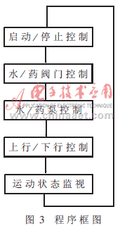 为了使系统工作可靠,不仅在硬件和软件中考虑了联锁保护和报警功能,而且为了防止传感器断线或电机中间被卡住,在编程中加入了系统的运行状态监视。即利用看门狗定时器的原理,用四个定时器分别监视水/药分离电机的运行状态和升降电机的运行状态,如果水、药阀门的动作时间或上行、下行的时间超过设定值,系统将停止电机的工作,并进行报警。程序框图如图3所示。