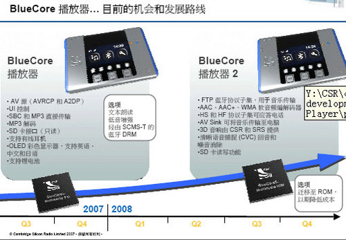 在关于SD卡mp3的问题上,吴松如博士又补充道:“我一直在强调这样的观点,我们不只是只有这样的一个SD卡蓝牙mp3解决方案,这只是我们的一个最 低端的解决方案,我们还有一些集成了多种功能的中高端的蓝牙mp3解决方案。现在BlueCore还是第一代的蓝牙MP3解决方案,我们是希望采用这种 flash的需要外置SD卡的MP3来开拓市场,并收集客户的反馈,以改进功能和使用体验。在明年3月的时候,我们将会发布功能更加强大,成本更低的第二 代BlueCore播放器" title="播放器">播放器,在这个播放器里面将会直接集成存储器,不会再是外置的SD卡了。”