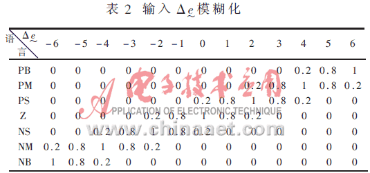 的取值:(负大、负中、负小、零、正小、正中、正大),表示符号{NB、NM、NS、Z、PS、PM、PB},语言值的隶属函数的选择,为计算简单取值与表1相同,如表2所示。