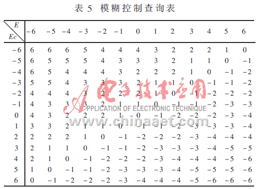 上面的计算过程比较复杂,可以使用软件编程实现。按照上述合成推理与解模糊方法可以得到一个容量为13*13的模糊控制查询表,如表5所示。