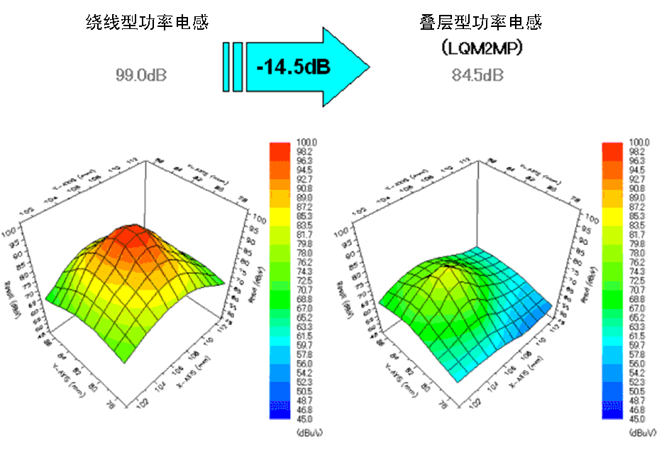 手机的电源电路中使用DC-DC转换器,使用的功率电感的磁束泄漏可能会诱发电源电路的不稳定,给电路造成不好的影响。这些问题可以通过使用磁束泄漏较少的叠层型功率电感来解决,可以阻止噪音干扰使电源电路保持稳定。另外,磁束泄漏少还能够使电源电路和周边的信号线等的电磁耦合减弱,抑制噪音诱发的信号纯度劣化。图6显示了绕线型功率电感和叠层型功率电感的磁束泄漏监测数据。与一直以来作为DC-DC转换器上使用的主要功率电感的绕线型功率电感相比,叠层型功率电感的磁束泄漏更少,现已证实闭合磁路的构造使磁束泄漏较少。这些数据表明在小型高速开关DC-DC转换器电路中使用小型叠层型功率电感的情况下,能够发挥它抗噪特性的特长。
