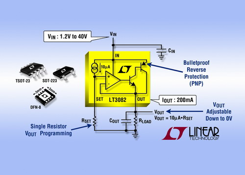 凌力尔特公司 (Linear Technology Corporation) 推出了新一代线性稳压器系列的最新成员 LT3082,该器件可用单个电阻器调至 0V,非常容易并联以获得更大电流。LT3082 200mA PNP 低压差稳压器 (LDO) 采用一种电流基准和电压跟随器的新架构。这种架构用少量 PCB 走线作为镇流电阻器,允许多个稳压器并联和输出电流共享。电流共享将热量分散到一个全表面贴装系统中。丰富的保护功能包括电流限制和热限制、以及针对稳压器和负载的反向输入保护。