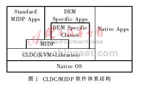 然而,消费类电器种类繁多,不同消费类电器家族对内存、用户界面、网络连接和可移植性方面的要求都有很大的差异,所以,仅划分为以上二大类配置是不够的。基于以上考虑,J2ME在Configuration基础上提出了Profile(描述)的概念。Profile定位于一个纵向设备类别或家族的特殊要求,提供configuration层中所缺少的设备功能(如UI图形界面、持续性存储)。Profile提供了应用程序级的接口,为消费类电子设备开发和装载的应用程序就建立在Profile层上(如图1所示)。目前定义的Profile有五类:移动信息设备描述MIDP(Mobile Information Devices Profile)、PDA描述、基础描述、个人Java描述和RMI描述。其中,MIDP是J2ME发展较为成熟的描述,它属于CLDC有限连接配置,目前已广泛应用于Java手机、双向寻呼、Palm和PDA设备中,成为移动数据应用的良好平台。本系统的移动数据应用模块就是基于CLDC/MIDP体系开发设计的。其软件体系结构如图1所示。