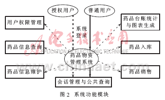 药品物资管理系统是基于MIDP/J2ME客户端和Java Servlet服务器平台实现的。系统功能模块主要包括用户登录与权限管理、药品信息查询、药品信息维护、药品入库、药品销售、药品台账统计与图表生成和公共查询模块等。图2为系统功能模块图。