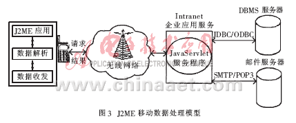 系统使用JDK1.4作为Java虚拟机;使用JSWDK1.0.1提供服务器端环境,由Java Servlet提供Web数据服务;数据库采用SQLServer2000;J2ME客户端开发与模拟调试采用J2ME Wireless Toolkit和Sun ONE Studio 4 ME。系统数据处理模型如图3所示。