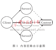 由于基于DNS服务来定位内容的效率不高,因此引入基于名字路由技术。基于名字路由技术将内容定位问题看作路由问题,其指导思想是:用户想要的连通性不是到某台特别的服务器或者某个特别的IP地址,而是连通一些用名字(一般是URL)指定的内容。这样复制的内容服务器可看作是提供访问内容的备用路由。内容层路由示意图如图1所示。假定每个服务器有需要被获取的内容,则用户可选择通过服务器1、服务器2或者服务器3获取。