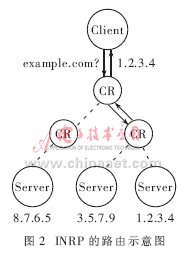 每个内容路由器维护1个名字到下一跳的映射集,就如同IP路由器维护1个地址前缀到下一跳的映射集那样。当有INRP请求到达时,内容路由器将根据请求的内容名字进行路由表的最长后缀匹配搜索,然后根据到达目的内容服务器时延最短的策略选择下一个内容路由器对等体。以这种方法,INRP请求被导向根据路由算法推断出的最近的内容服务器。INRP的路由示意图如图2所示。当INRP请求到达临近目的内容服务器的最后一个路由器时,此路由器返回一条应答信息,应答信息包含目的内容服务器的地址。如果遇到内容路由器或内容服务器没有反应,则中间内容路由器会选择备用路由并重新查找名字。用这种方式,使用户请求可以通过最佳路由导向被要求的内容,并能从失效的内容服务器或者过时的路由信息中恢复,这使得INRP在内容层能应对任何情况。同时路由在服务器名字级进行,这样,URL中的目录名可移到服务器名字的前面,如http://foo.com/bar/index.html可变成http://bar.foo.com/index.html。