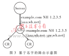 基于名字的路由示意图如图3所示。基于名字的路由通告中包含如下信息:(1)内容服务器名(URL)。(2)到达内容服务器的下一跳(CS或CR)。(3)到达内容服务器的内容路由器路径。内容服务器的路由通告也可以包括服务器的负载(用响应时间表示)。这个额外的属性表明较长响应时间的内容在更“远”处,内容路由器可以在路由选择时将它作为额外的跳数。