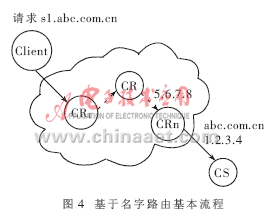 基于名字路由的研究往往与CDN联系在一起。基于名字路由的基本流程如图4所示。互联网上有一个CDN的节点服务器CS,此服务器域名为abc.com.cn。基于名字路由分成以下几部分:(1)路由通告。CS用NBRP协议向它邻近的内容路由器CRn进行路由通告(包括CS可达信息等),CRn同样用NBRP协议将CS的内容可达信息通知CRn的邻居对等体。(2)用户请求。如用户Client请求访问s1.abc.com.cn,该请求到达预先配置的内容路由器CR1,由CR1进行路由表查询,根据最长后缀匹配原则,筛选出与用户请求的名字(s1.abc.com.cn)匹配的路由项,并根据最小时间延迟选择下一个对等体。假定离用户最近的目的内容服务器为CS(abc.com.cn,1.2.3.4),则基于这种方法,INRP协议将名字请求路由到内容路由器CRn(5.6.7.8),CRn即为最临近CS的内容路由器。(3)CRn返回应答信息。该条信息包含CS的IP地址(1.2.3.4),应答沿着INRP请求经过的内容路由器返回。(4)访问内容。用户根据INRP请求过程得到的CS的IP地址,向目的地址发起HTTP等内容请求,获取用户想要的内容。