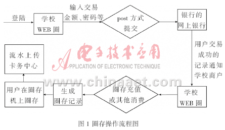 目前我国高校的校园卡圈存通常采用传统圈存技术,传统技术接入方式是以太网控器作为接入设备,通过圈存机将交易报文在银行系统和校园一卡通系统中的卡务管理中心子系统之间进行传送,银校圈存系统通过银行卡与校园卡一起插入转账圈存机以达到把用户的银行卡账户下的金额划入校园卡账户中为目的[1],传统圈存方式的圈存机具有价格昂贵、位置移动不灵活、设计复杂、故障率偏高等不足,而且经常会出现银行和学校交易流水账务不一致的情况;同时,该模式下的学校与银行的实时通信信道需向通信部门租用一条专线,增加了工程的设计成本与维护费用。鉴于此,在计算机比较普及和计算机网络高度发展的今天,结合高校的实际情况,笔者探索出一种全新的圈存思路和设计,实现校园卡单卡圈存(即圈存时仅使用校园卡),设计一种基于WEB圈存的方式以克服传统圈存方式的不足,大大降低了系统的开发和材料成本,使其设计与应用真正做到经济、简单、方便、实用和圈存机移动、接入方便。