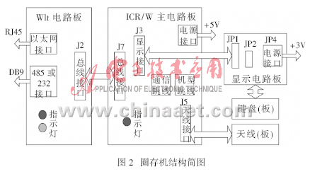 圈存机硬件处理单元结构如图2所示。系统由主控板、网络通(wlt)、显示电路板、键盘板、读卡器天线板等主要部分组成。