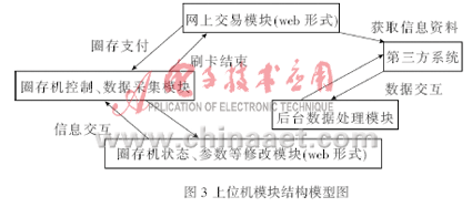 系统设计采用模块化程序结构,由WEB圈存缴费子系统、圈存机控制和数据采集处理模块、圈存机状态和参数修改模块、后台数据处理组成。上位机部分的主要结构模型如图3所示。