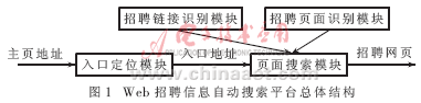 招聘网页搜索系统由4个模块组成:入口定位模块、招聘链接识别模块、招聘页面识别模块和页面搜索模块。Web招聘信息自动搜索平台总体结构如图1所示。