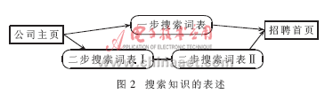入口定位模块采用的是自主搜索算法。其原理是基于分步的思想。假设要查找美国高校计算机方面的论文,首先可以在一个大学网址中查找计算机系主页,找到后可以查找相应的教员目录,然后通过每个教员找到论文所在的页面。在搜索过程中查找的页面称为路标网页。这样的分步查找可以极大提高搜索效率,总的搜索页面个数将大量减少,而且也提高了准确度。如果应用搜索知识的自学习,将使随后的搜索更高效。由于招聘页面一般离主页距离较近(即经过很少的点击就可以到达招聘页面),所以不需要设置路标页面,只需要在不同的分步中构建关键词词表。搜索知识的表述如图2所示。