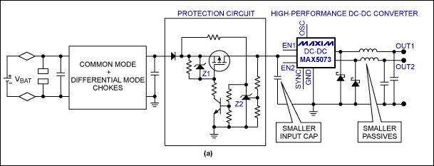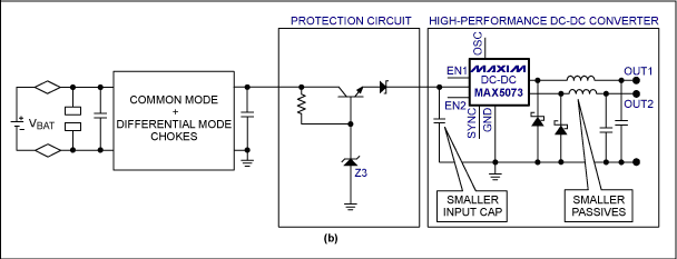 开关频率对于开关转换器设计非常重要,因为开关电源的很多问题都与工作频率有关。开关频率和它的高次谐波会对其他电路产生电磁干扰,例如,一个调幅收音机对于530kHz到1710kHz的干扰非常敏感。开关频率超过1710kHz时才能消除基波和高次谐波的干扰。测试数据显示,中等电压、高频处理器配合简单的保护电路" title="保护电路">保护电路,正如Maxim产品所采用的架构,可以提供完美的汽车电源管理方案。所以,设计人员不需要高压控制方案即可设计合理的开关转换器。