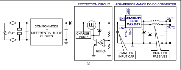 如图9所述,MAX6398功能模块完全支持汽车应用中的甩负载设计,提供低电压、高性能输出。利用保护电路、低电压、高频工作特性可有效节省电路板空间,降低成本。