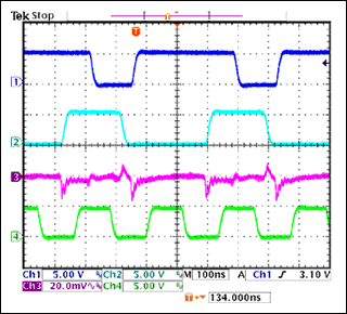 图7. MAX5073双buck转换器的输入纹波、开关波形测试结果,转换器分别工作在2.2MHz开关频率,输入电容纹波的的频率为4.4MHz (CH1 = 第2路时钟源; CH2 = 第1路时钟源; CH3 = 输入电容纹波; CH4 = 时钟输出)。