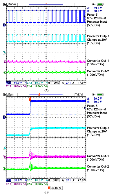 图8A和8B. 脉冲(80V,120ms,OEM#5)作用在保护器" title="保护器">保护器的输入, MAX5073连接在保护器的输出,监测转换器的第1路和第2路输出。