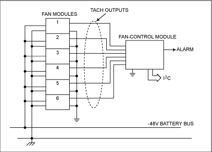 大多数电信系统包含很多风扇。为保证在一个风扇出现故障的情况下系统仍能正常工作,系统经常放置超过理论所需数目的风扇(N+1结构),这样,一个系统可能会用到6至8个风扇。每个风扇都有自己的电源,使风扇可以很容易地替换而不需要关闭整个系统。一个子机架风扇组(图1)可能包括多个风扇模块(譬如6个),它们由-48V" title="48V">48V电池总线供电,且由一个风扇控制模块统一控制。
