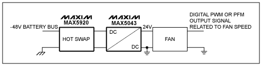 这种类型的风扇系统可以有很宽的芯片选择范围。各种各样的热插拔控制器可以满足不同性能级别的需求。譬如,Maxim的MAX5901只提供一个简单的解决方案,而MAX5920则可以提供更高的精度,这两种控制器都可以直接由-48V驱动。隔离电源可以选择MAX5021;内置功率MOSFET的高集成度" title="高集成度">高集成度转换器可以选择MAX5043,它只需要一个变压器、一个电容、一个输出二极管和几个电阻就可以提供50W的输出功率,而且不需要散热片。