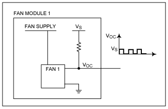 我们定义报警信号用于判决被检测风扇是否转动。目前大多数风扇都可以提供一个集电极开路输出信号(VOC),它通过一个电阻上拉到外部电压(VS) (本例从4V上拉到30V)。风扇每转一圈,该VOC输出几个(M)幅度在0V到VS间的脉冲(图3)。