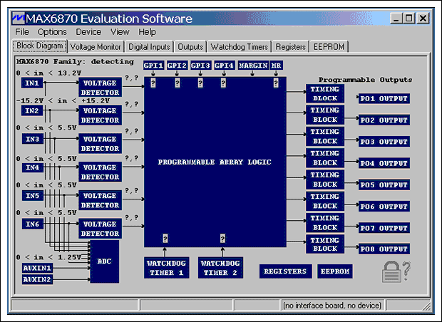 通过简单地指向界面中的某一个模块并输入适当的数值(如输入信号、时序等),工程师可以十分容易地配置MAX6870。经过适当配置后,点击“"Load to Memory”按键对芯片装载设置。MAX6870是第一款为复杂系统设计的多输入控制器。由于精度高、易于编程等特点,大大简化了系统设计。