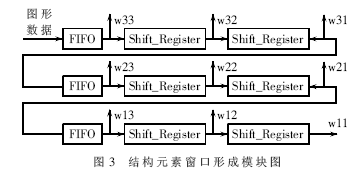 形态学图形膨胀算法,是用结构元素对图形某邻域窗口进行的处理[7]。本设计采用的是3×3的方形结构元素,每次需要读取9个数据。为此,在FPGA内部定义了寄存器和FIFO,将相关的图形灰度数据进行存储,以使其在一个时钟周期内,以流水线的方式形成填充所需要的一个结构元素窗口。流水线的方式,加快了数据处理速度。结构元素窗口形成模块框图如图3所示。图中,w22为结构元素原点,如图4所示。