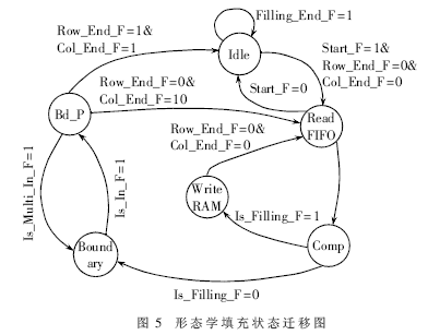 图形填充模块的状态迁移图如图5所示。本设计根据需要设定了六个状态:Idle、ReadFIFO、Comp、WriteRAM、Boundary、Bd_P。这六个状态根据窗口位置是否有种子而进行转换,从而完成图形填充。