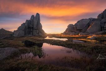 照片拍摄于新州Thredbo, 左图是清晨日出时分的彩云,右图是晴转阴后,黄昏时分乌云密布