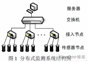 本文中所设计的RS422接口方案主要用于工控环境中的分布式监测系统,此系统的结构 示意图如图1所示。该系统主要可分为四个层次结构:服务器、交换机、接入节点、传感器 节点。其中传感器节点负责采集信号,首先对信号进行放大和抗混叠滤波,然后通过A/D芯 片将模拟信号转换为数字信号,最后通过RS422接口将采集到的数据传送给接入节点;接入 节点一方面负责接收来自服务器的命令,对各个传感器节点进行管理,另一方面将来自于近 端的各个传感器节点的有效数据通过以太网接口发送给远端的服务器;交换机主要作用是将 服务器和各个接入节点通过以太网连接起来;服务器则负责数据的接收、分析、存储并显示 结果以及对整个系统的管理。