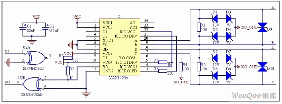 MAX1490A转换速率可达5.5Mbps,隔离电压可以到2500V,可以承受高电压持续时间较长的瞬 态干扰。同时MAX1490A是将高频变压器、光耦、MAX490等元件集成到一个IC里面的单芯片, 电路实现起来也比较容易。MAX1490 AEPG是MAX1490A系列中的一款工业级芯片,使用温度范 围较商用级更广,为-40°C 到 +85°C。使用MAX1490AEPG设计的电路原理图如图2: