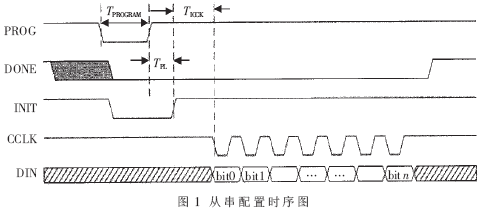 从串配置时序图如图1所示。TPROGRAM是配置逻辑的复位时间,对Xilinx VIRTEXE和VIRTEX2系列,最小应大于300ns。TPL为复位延迟时间,表明配置逻辑复位的延续。对VIRTEXE系列来说,当复位信号PROG变为高电平时,INIT立即变为高电平,配置逻辑就可以接收配置数据流;而对于VIRTEX2系列,TPL最小有500ns的延迟。TICCK为配置时钟CCLK的输出延迟。