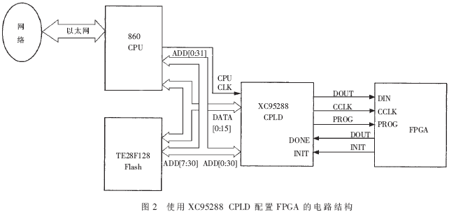 国家数字交换系统工程技术研究中心承担的国家863项目高性能IPv6核心路由器采用一片Intel E28F128J3A150 16位Flash作为BootFlash对PowerPC860(MPC860)处理机进行加电配置下载更新的方案,其多余的存储空间完全可以存放下FPGA所需的配置文件。加电复位、系统启动后,由处理机与一片 Xilinx XC95288XL CPLD配合,控制FPGA配置文件从Flash下载到FPGA中,完成对FPGA的配置。860处理机支持网络功能,当配置文件需要更新时,可通过网络将新的配置文件发送到处理机,然后再由处理机更新系统中的Flash。采用XC95288 CPLD配置FPGA的具体电路设计结构如图2所示。