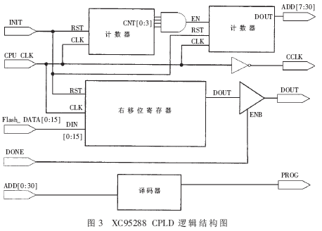 图2中,CPLD主要功能是把从Flash中读出的数据转换成串行输出,然后再将地址递增。CCLK信号由CPU时钟产生。PROG信号则由CPU输出的地址数据经译码模块产生。XC95288C PLD逻辑结构如图3所示。