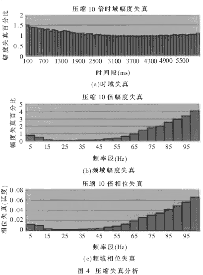 实验平台为Linux系统,硬件配置为P4 2.0G、256MB内存。本方案的压缩和解压速度可达10MB/s,占用的内存量可控制在20MB以内,且与地震数据文件的大小无关。图4给出了LWT压缩方案在时域和频域的失真分析。如图4(a)所示,失真随时间基本呈均匀分布,较好地保留了深层微弱信号。图4(b)、4(c)显示在信号能量集中的10~60Hz频段失真很小,60~100Hz的中高频段失真也控制在较低的范围内。