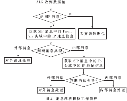 消息解析模块主要对流经ALG的SIP消息进行解析,并判断该消息是内部消息、对外消息还是对内消息,以便消息修改模块能对这些消息进行正确的处理。消息解析模块的工作流程如图4所示。它主要判断数据包From、To、Via等头域中的IP地址信息,以准确解析消息类型。