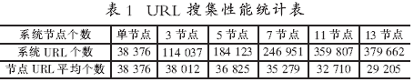 系统的搜集节点分别设置为1、3、5、7、11、13,得到URL搜集性能统计表如表1所示。