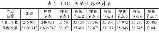 URL匹配性能统计表如表2所示。由表2得出,系统中URL很好地散列到各个节点且节点上的URL匹配成功率非常高。主要匹配集中在URL控制节点上,此节点不负责对信息的搜集,只是用来调度跨节点的URL和构造URL数据结构表,控制节点采用定时有限的调度方式,因此,控制节点任务的繁重不会使系统的搜集性能下降。