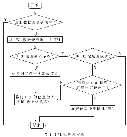 该方案URL的处理流程:首先根据Spider解析出的URL表对URL实行节点定位,每个节点单独处理定位到本节点URL,对于定位后发现不属于本节点的URL,发送到控制节点;然后控制节点对这些URL定位,在合适的时间发送URL到其定位节点;同时每个节点对本节点搜集到的URL在控制节点做实时更新及控制节点上待定位的URL做相应处理,以免造成URL重复处理,搜集节点与控制节点采取定时、有限的通信。URL处理流程如图1所示。