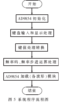 软件采用结构化、模块化设计。其主要的功能模块有:AD9854初始化模块、键盘输入和显示处理模块、单频连续波模块、单频脉冲波模块和线性调频脉冲波模块。控制CPU选用89C51,各模块采用汇编语言编程,其系统程序流程图如图5所示。