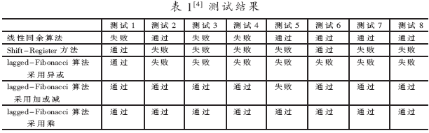 对三种算法的性能进行测试,包括随机数在分布上的均匀性、随机数在随机序列中分布的均匀性和随机序列中子序列的依赖关系等内容。结果如表1所示。其中,满足测试要求视为通过,不满足视为失败。