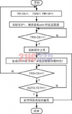 发送数据时的工作流程如图4所示。当MCU有遥控数据节点时,接收点的地址 (TX- address) 和有效数据 (Tx- payload) 将通过SPI接口传送给nRF905。设计时应使用协议或MCU来设置接口速度。可用MCU设置TRX-CE,并使TX- EN为高电平来激活nRF905的ShockBurst传输。通过nRF905的ShockBurst可使无线系统自动上电,并完成数据包 (应加前导码和CRC校验码) 的数据码发送。