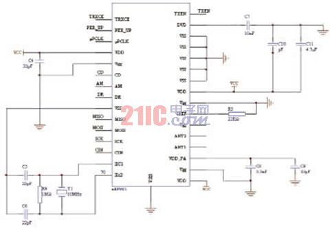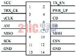 nRF905 模块的高频头用户接口电路管脚图如图1所示。