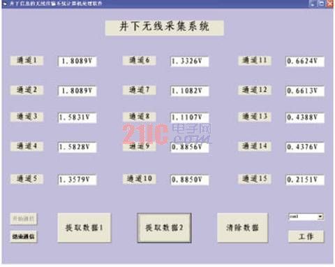 图6中通道1至通道15分别实测井参数量化台阶数转换过后的模拟电压值,其中包括压力、温度、湿度、三轴重力加速度传感器输出值(Gx、Gy、Gz)以及翼肋位移等等。在实际应用中可较为直观地显示出来。