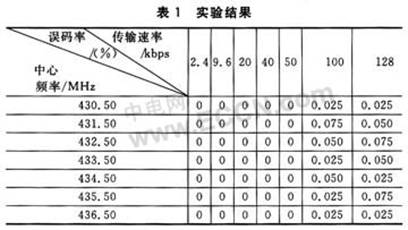 为验证本无线射频收发系统设计的可靠性,进行了7组“发射模块—接收模块”通信实验。在空旷地通信距离约为1 500 m时7组“发射模块—接收模块”分别工作在430.50 MHz、431.50 MHz、432.50 MHz等7个中心频率上,带宽均取112.8 kHz,频率偏移取±25 kHz,发送4 000个数据包,实验结果如表1所列。