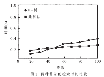 将此算法和R-树算法在相同的数据集上针对不同维数测试,两种算法的检索时间如图1所示。