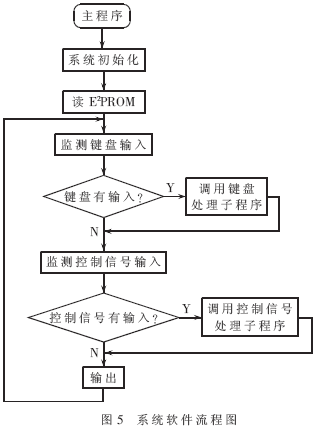 本系统软件采用模块化的方式编写,有利于日后的维护和升级。主要包括键盘监测模块、控制信号监测模块、控制信号处理模块、显示模块、定时模块、输出模块等。系统采用查询方式接收信号输入,软件流程如图5所示。