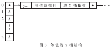 (1)等值线Y桶。等值线Y桶用于记录等值线的基本信息,桶的长度与扫描线的条数一样多,其编号与扫描线序号一致。每条等值线都要生成一个桶记录项,记录该等值线的最大Y坐标ymax、指向等值线的指针和指向该等值线边Y桶的指针。桶记录项按等值线的最小Y坐标插入到桶中。图3为等值线Y桶数据结构的示意图。