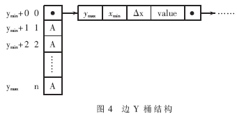 (3)边Y桶。每条等值线都由一系列的边组成,为了利用相关性,需要建立等值线的边Y桶,记录每条边的基本信息。等值线边Y桶的长度等于与该等值线相交的扫描线的条数。对于等值线中的每条边都要产生一个边记录,记录该边的最大Y坐标ymax,Y值较小端对应的X坐标xmin,当扫描线增大1时X坐标的增量Δx,以及等值线的值value。每一个边记录按该边的最小Y坐标和整条等值线的最小Y坐标的差值存入边桶中,图4为边Y桶数据结构的示意图。
