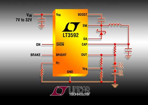 凌力尔特" title="凌力尔特">凌力尔特公司 (Linear Technology Corporation) 推出用作恒定电流 LED 驱动器的 36V" title="36V">36V 降压型 DC/DC 转换器 LT3592。其内部 36V、900mA 开关使该器件能够从 36V 输入驱动由多达 6 个 500mA 白光 LED 组成的单个 LED 串,适用于工业和 LED 标志应用。它还可以用 12V 铅酸蓄电池输入驱动两个 500mA LED,适用于汽车应用。LED 串联连接可使 LED 的电流相同,从而实现一致的亮度且无需镇流电阻。LT3592 的开关频率" title="开关频率">开关频率可以通过单个电阻在 400kHz 至 2.2MHz 的范围内进行调整。这使得设计师能够将开关频率设置为高于关键的频段 (例如: AM 无线电),同时最大限度地减小外部组件尺寸。LT3592 采用